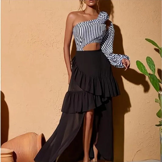 Tek omuzlu çıkarılabilir balon kollu mayo ve fileli etek pareo