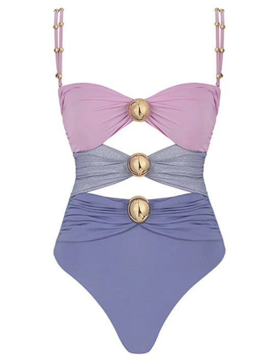 Renk bloklu kesikli tek parça gümüş aksesuarlı mayo
